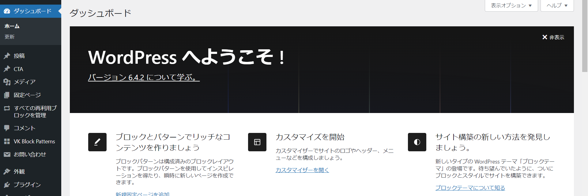 wordpressにログインすると、管理画面=ダッシュボードが表示されます。