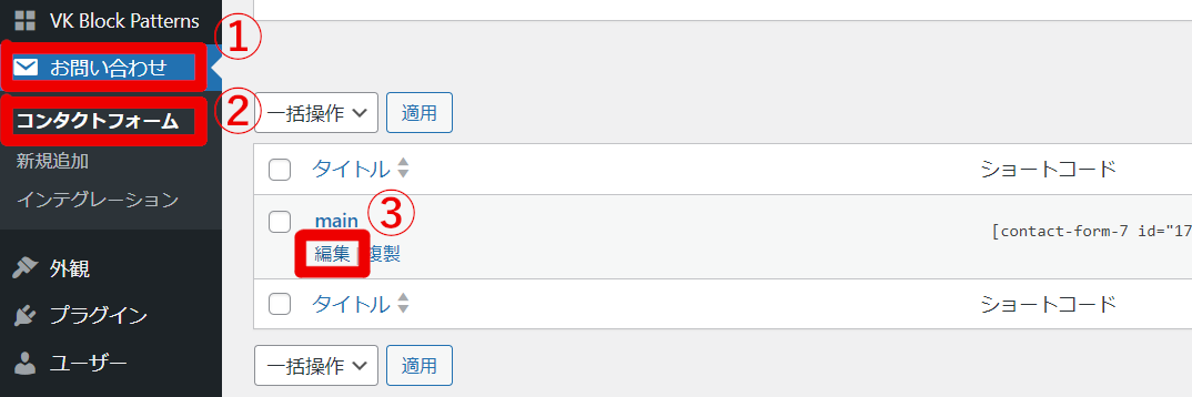 ダッシュボードから①「お問い合わせ」→②「コンタクトフォーム」→③「main」下の「編集」へ進む。