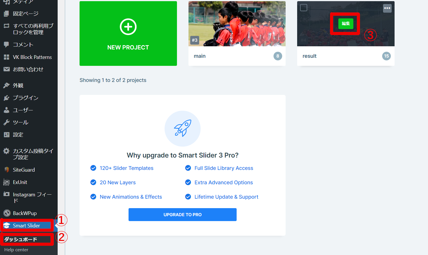 ダッシュボードから①「Smart Slider」→②「ダッシュボード」→③「result」から「編集」へ進む。