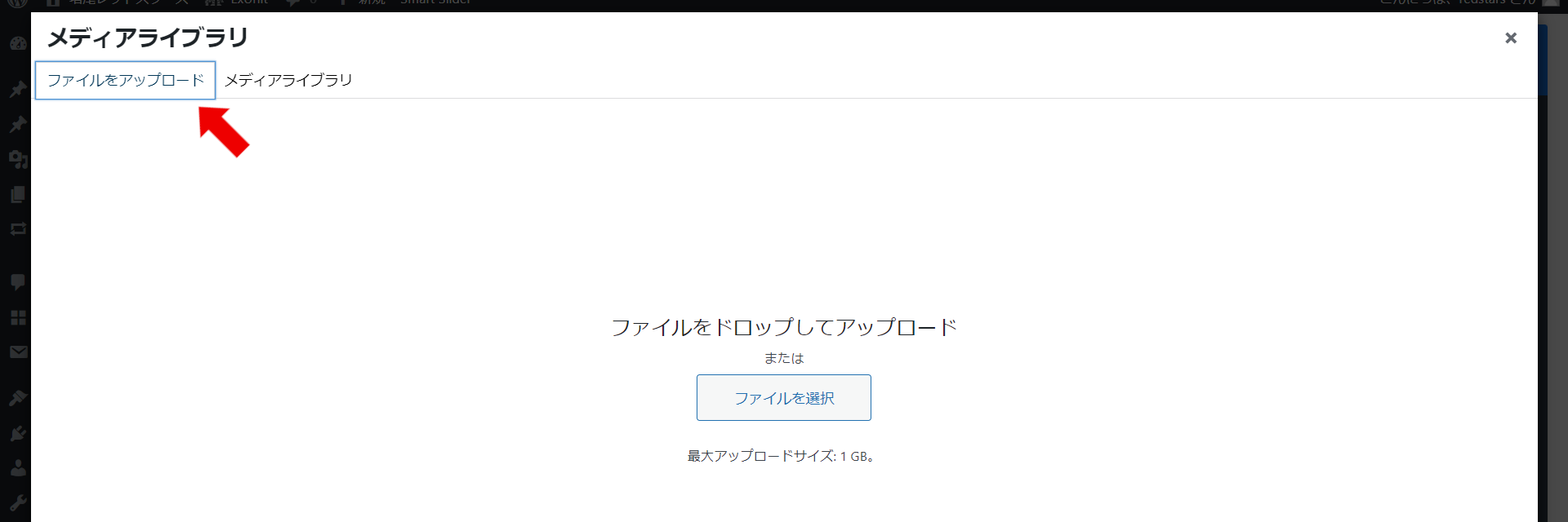 メディアライブラリに移動するのでパネル「ファイルをアップロード」を選択し、画面に従って画像をアップロードする。