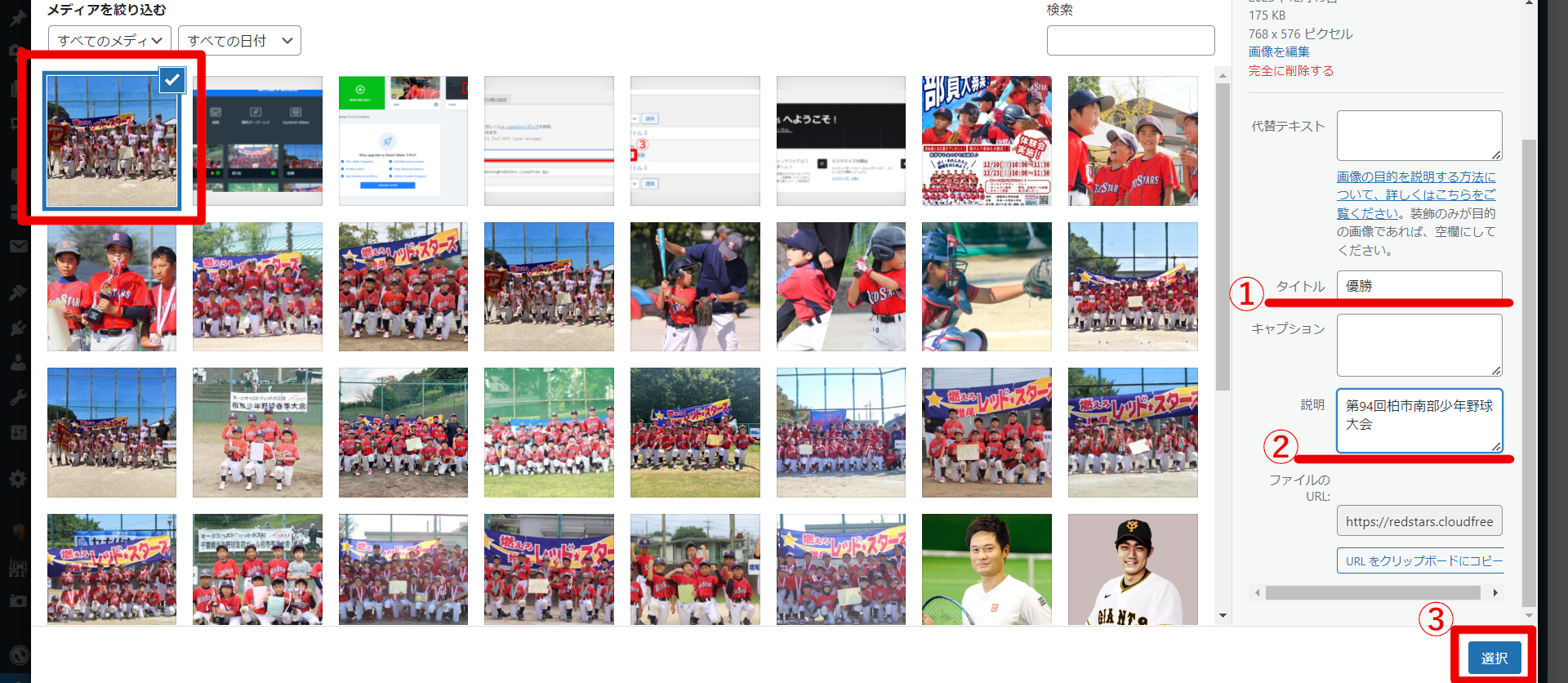 画像がメディアライブラリに追加されたら①タイトルに「順位」、②説明に「大会名」を記入し、③「選択」へ進む。