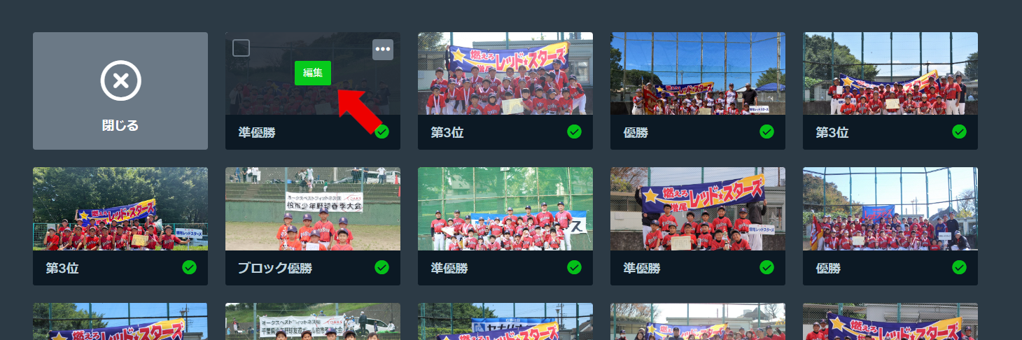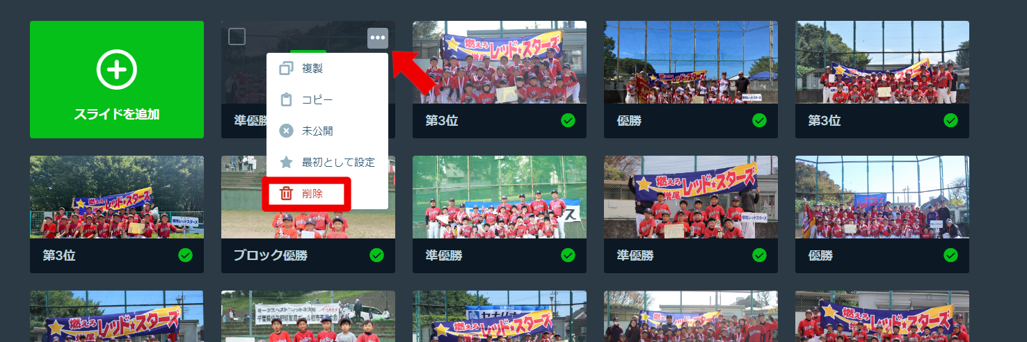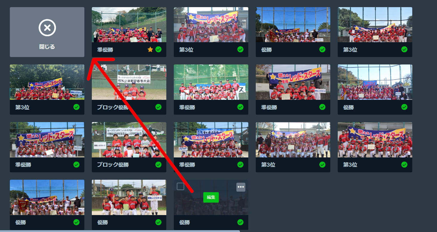 大会で入賞した場合は、スライダーに集合写真の追加をお願いします。