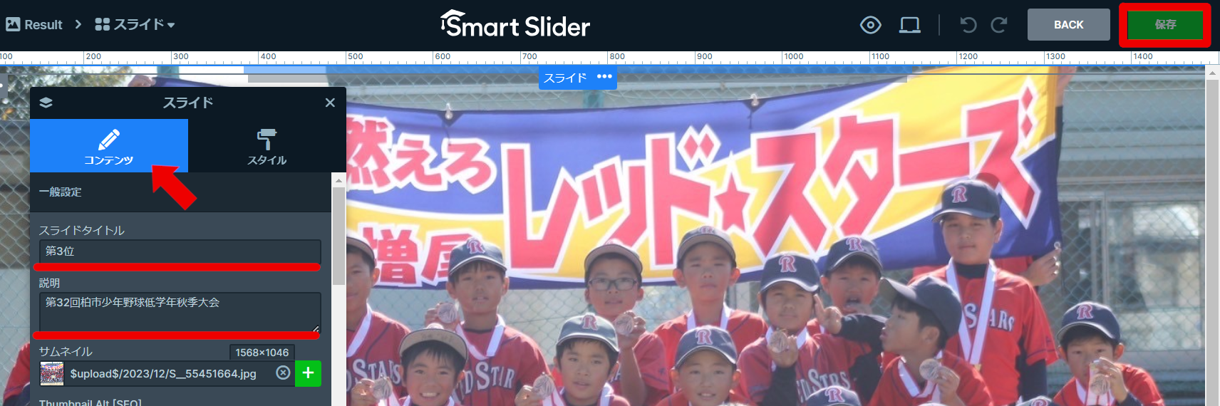 編集画面に移動したらパネルを「コンテンツ」に切り替え、「スライドタイトル」「説明」を編集し、最期に右上の「保存」をクリックする。