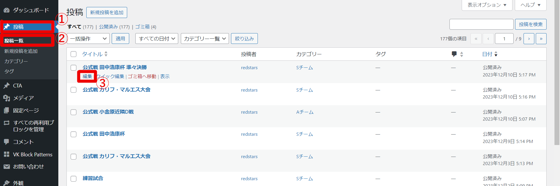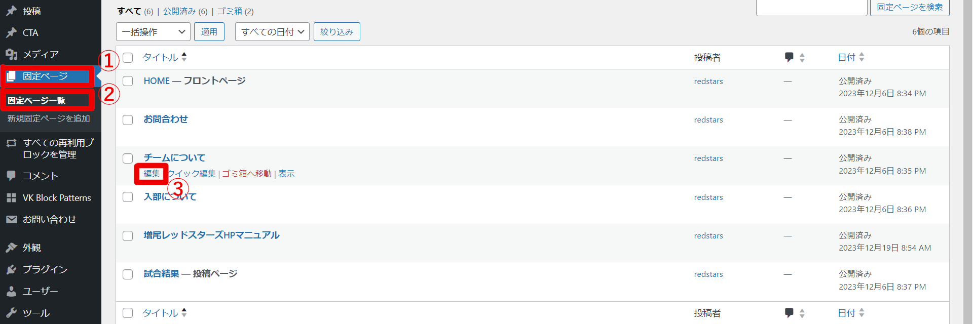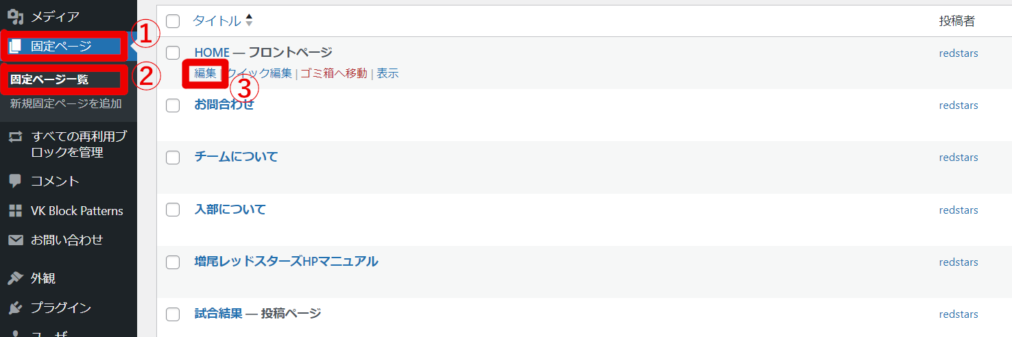 ダッシュボードから①「固定ページ」→②「固定ページ一覧」→③「チームについて」下の「編集」へ進む。