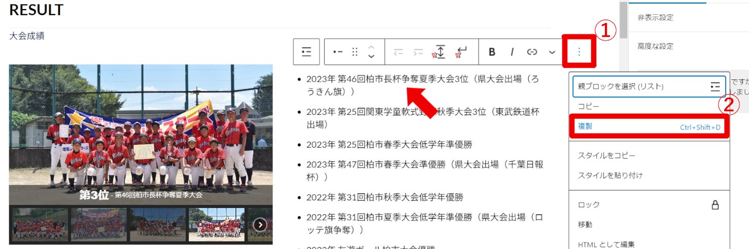 大会成績リストの一番上にある大会名をクリックし、①「︙」→②「複製」をクリックする。