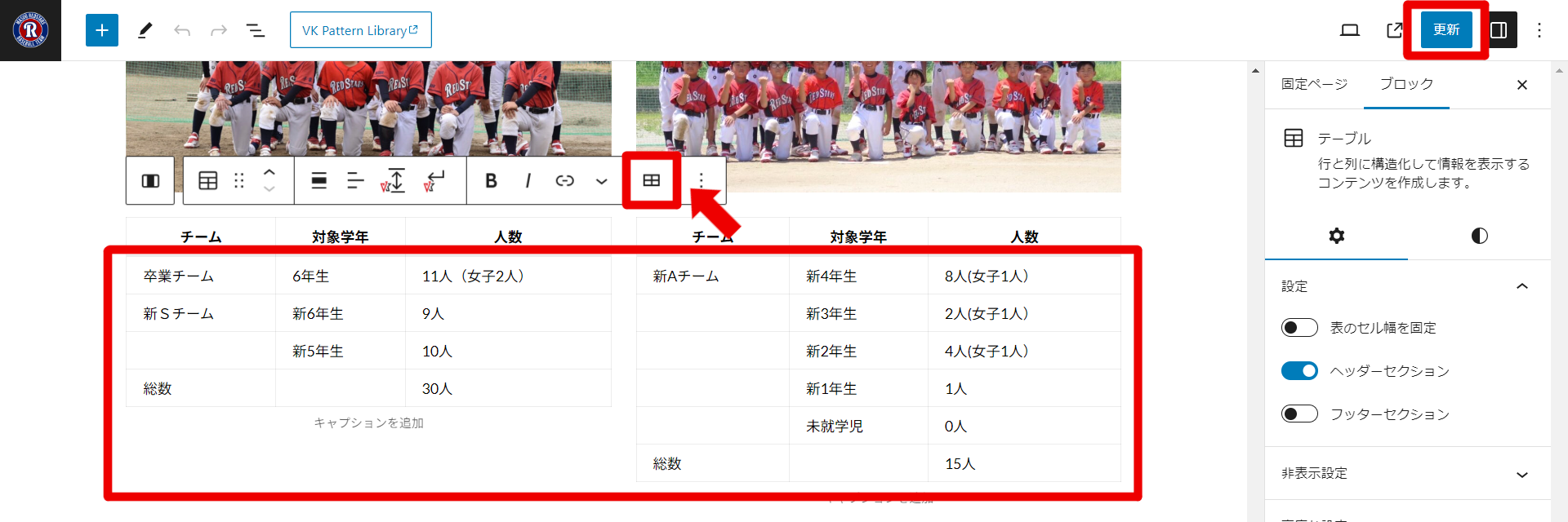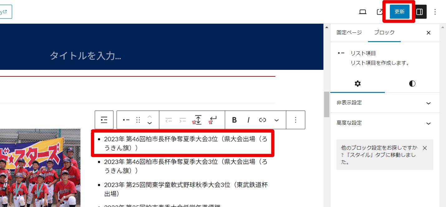 集合写真変更と同様に固定ページ「チームについて」の編集画面へ進む。