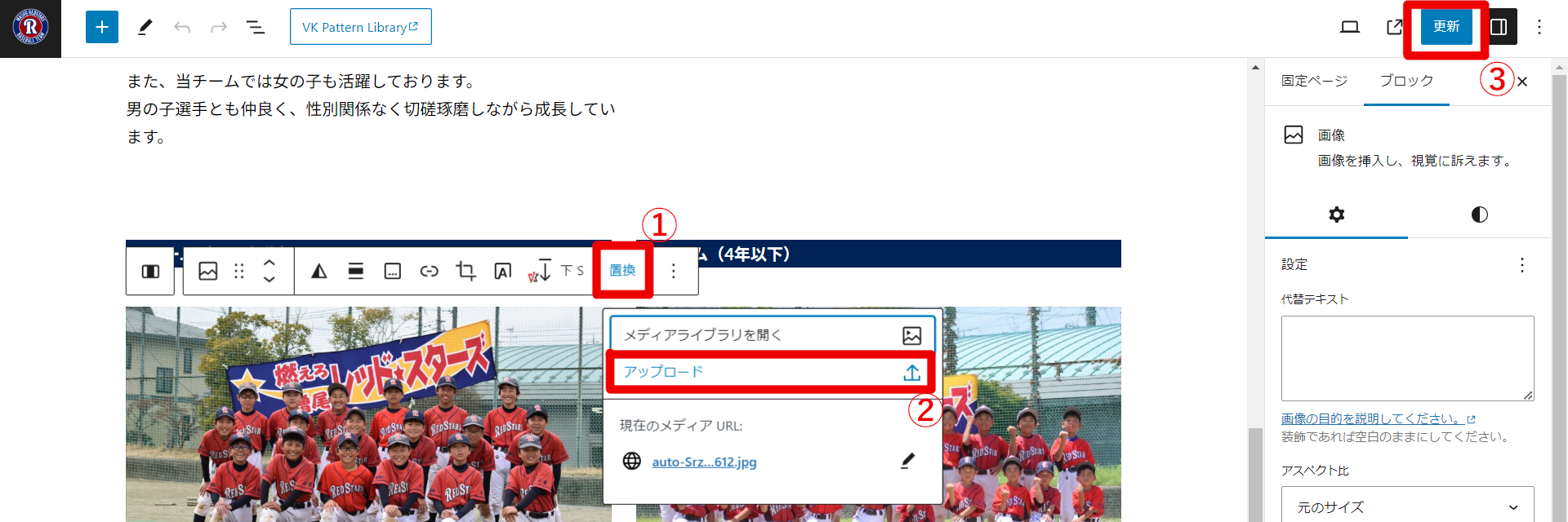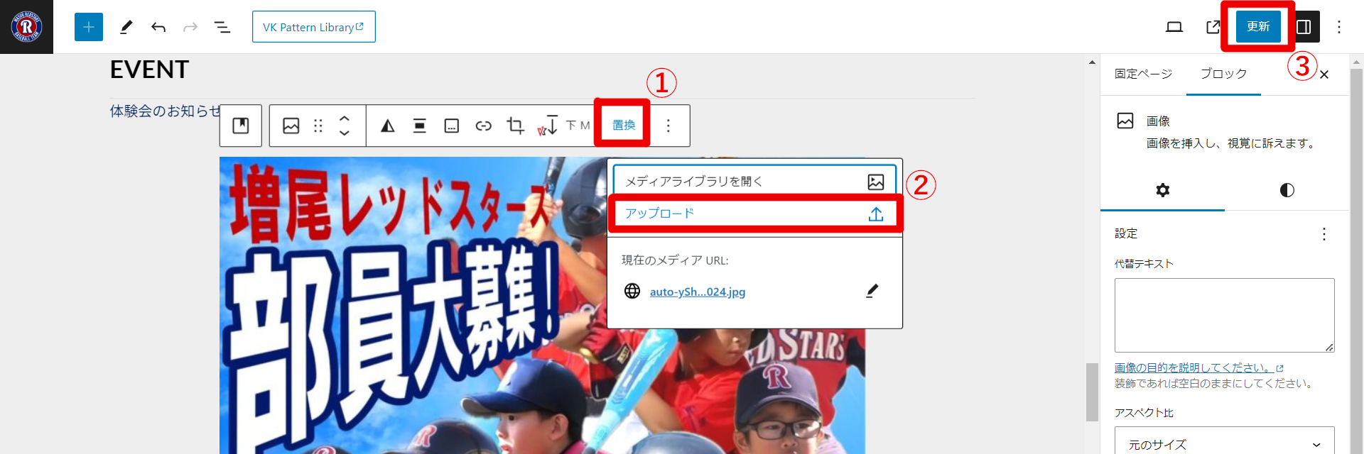 体験会の画像をクリックし、①「置換」→②「アップロード」で新しい画像をアップロードしたら、③「更新」をクリックする。