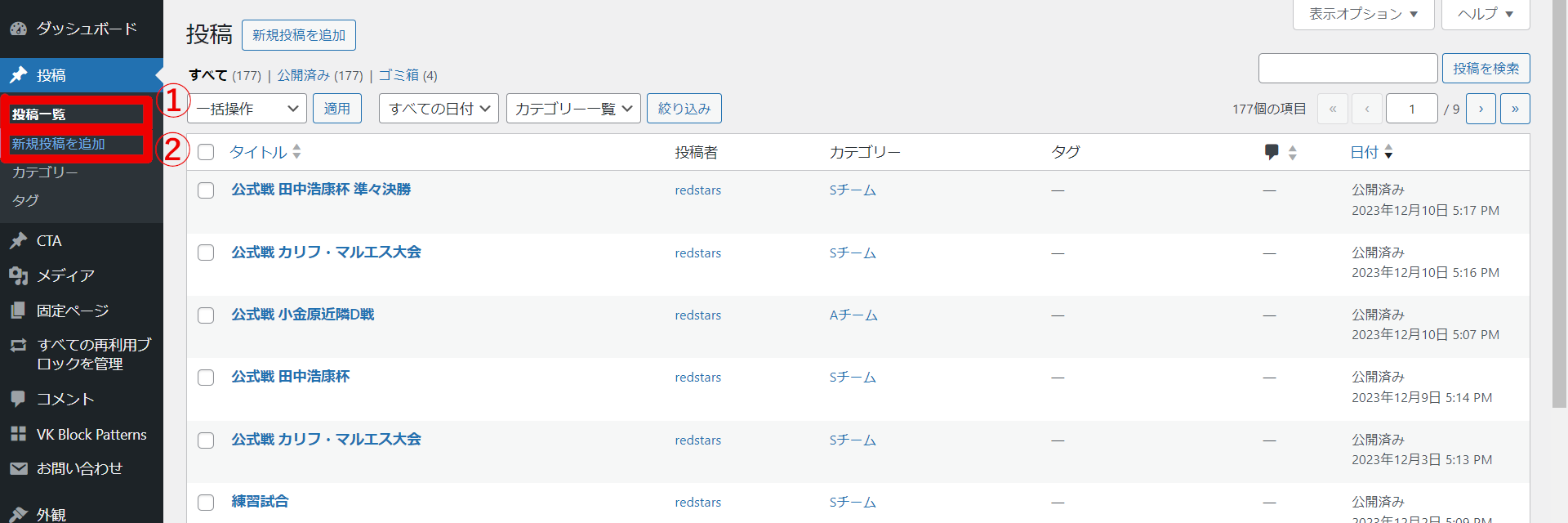 ダッシュボードから①「投稿」→②「新規投稿を追加」へ進む。