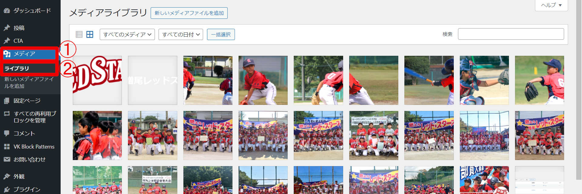 ダッシュボードから①「メディア」→②「ライブラリ」へ進む。